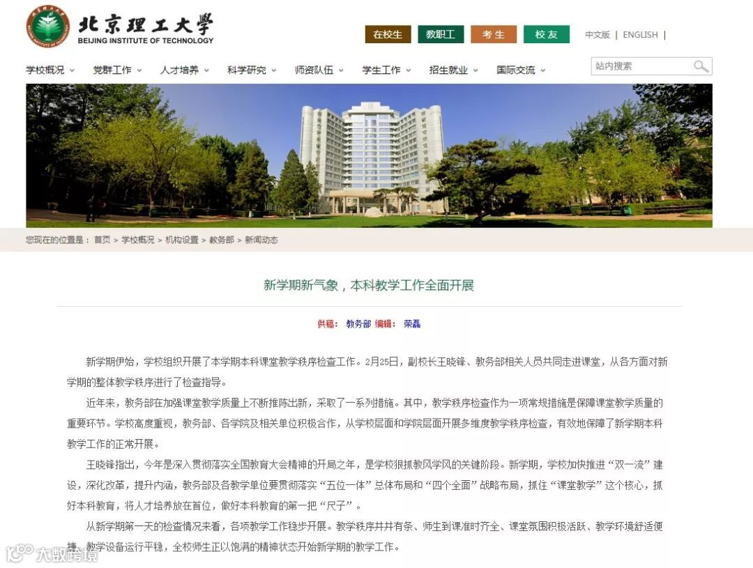 无独有偶,北京理工大学教务部也在2月25日发布的新闻动态《新学期新气象,本科教学工作全面开展》一文中强调,“教学秩序检查作为一项常规措施是保障课堂教学质量的重要环节”,“今年是深入贯彻落实全国教育大会精神的开局之年,是学校狠抓教风学风的关键阶段”。