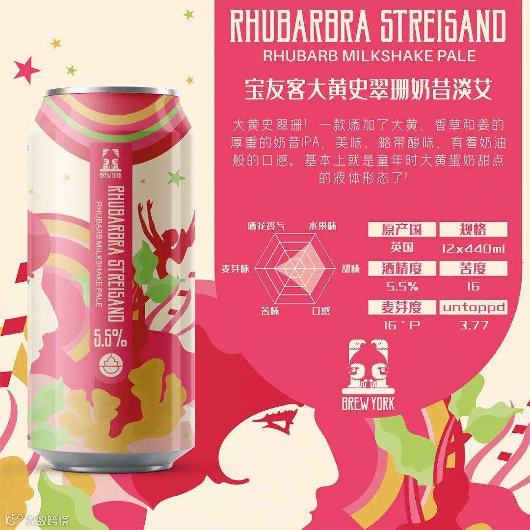 大黄史翠珊!一款添加了大黄、香草和姜的厚重的奶昔IPA,美味,略带酸味,有着奶油般的口感。基本上就是童年时大黄蛋奶甜点的液体形态了!
