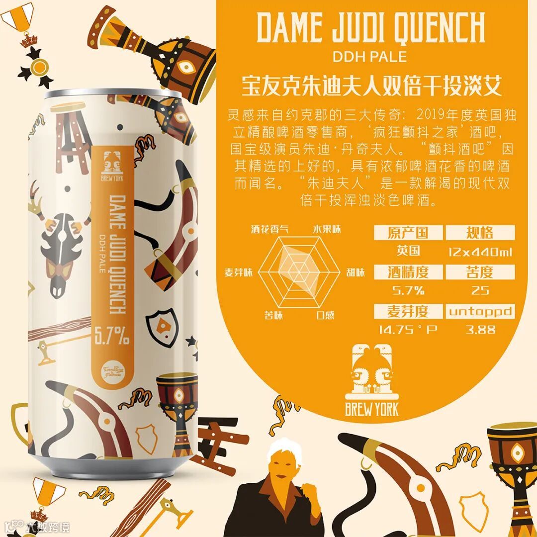 灵感来自约克郡的三大传奇:2019年度英国独立精酿啤酒零售商,‘疯狂颤抖之家’酒吧,国宝级演员朱迪·丹奇夫人。“颤抖酒吧”因其精选的上好的,具有浓郁啤酒花香的啤酒而闻名。“朱迪夫人”是一款解渴的现代双倍干投浑浊淡色啤酒。