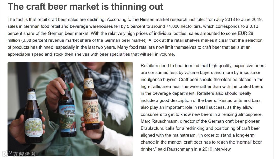 事实是,精酿啤酒零售额正在下降。根据尼尔森市场研究所的数据,从2018年7月到2019年6月,德国食品零售和饮料仓库的销售额下降了5%,降至约74,000百公升,相当于德国啤酒市场的0.13%的份额。由于单个瓶子的价格相对较高,销售额约为2800万欧元(占德国啤酒市场收入份额的0.38%)。从零售货架上可以清楚地看出,产品的选择已经减少,尤其是在最近两年。现在,许多食品零售商都只卖销售速度快的精酿啤酒,并在货架上摆放了可以批量销售的特色啤酒。