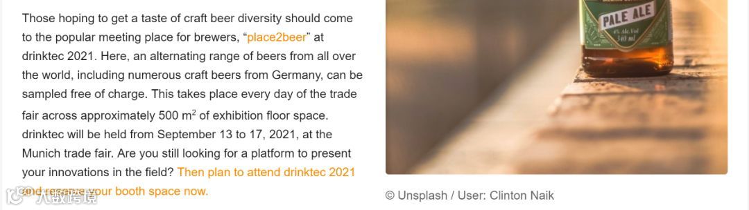 希望品尝精酿啤酒多样性的人会来Drinktec 2021上的 “place2beer” ——最受酿酒商欢迎的聚会场所。在这里,约500平方米的展览场地,每天你可以品尝到来自世界各地的各种啤酒,包括免费试饮来自德国的众多精酿。Drinktec将于2021年9月13日至17日在慕尼黑交易会上举行。您是否还在寻找一个平台来展示您在该领域的创新?请安排计划参加Drinktec 2021并立即预订展位吧。