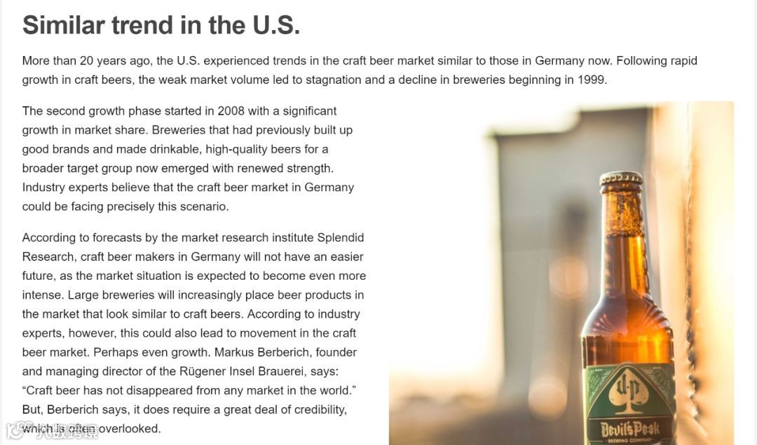 20多年前,美国在精酿啤酒市场中经历了与现在德国类似的趋势。随着精酿啤酒的快速增长,从1999年开始,市场疲软导致停滞和酿酒厂数量下降。