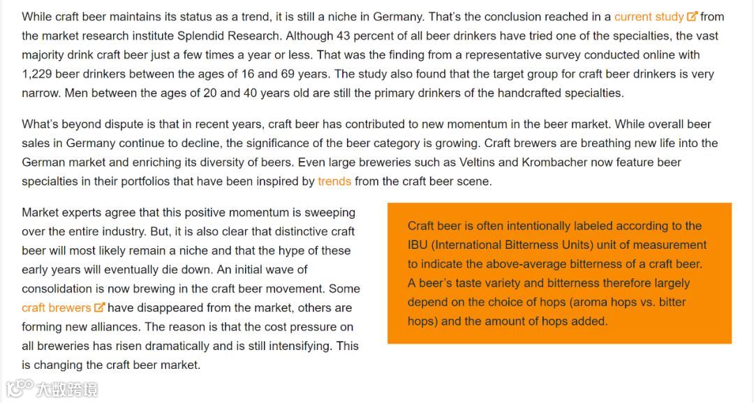 毋容置疑,近年来,精酿啤酒推动了啤酒市场的新发展。尽管德国的啤酒总销量持续下降,但啤酒类别却在增长。精酿啤酒厂为德国市场注入了新的活力,并丰富了啤酒的多样性。现在,甚至大型啤酒厂例如Veltins和Krombacher受到了精酿啤酒行业趋势的启发,在其产品组合中加入了精酿特色啤酒。