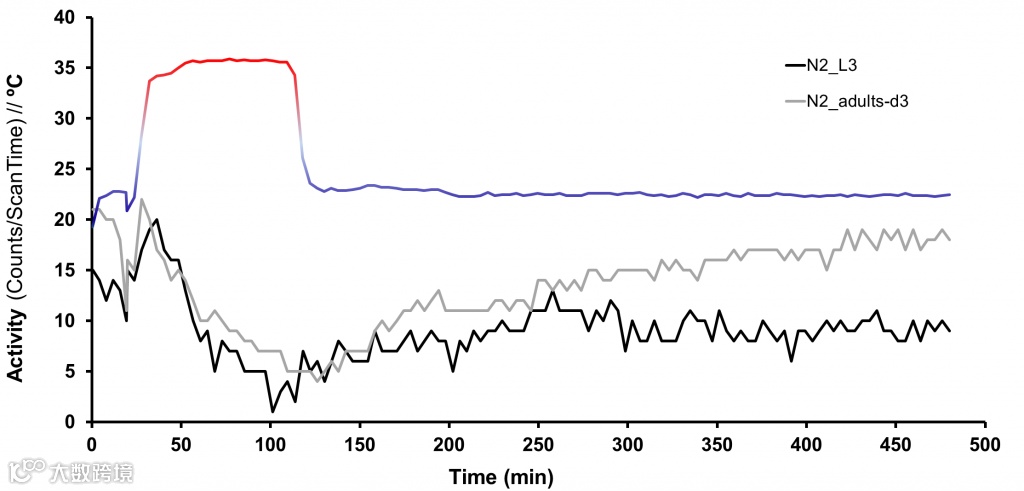 在本实验中,我们可以观察到虫群在温度胁迫下的行为动态效应,在L3幼虫和3龄成虫中可观察到不同的反应。