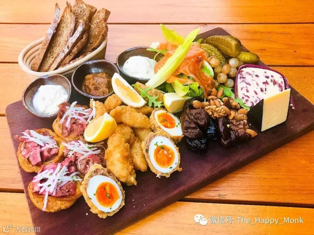 约克郡布丁配自制辣根酱,北欧盐渍三文鱼、英式炸鱼块配塔塔酱,萨摩戴尔蔓越莓车达芝士,萨摩戴尔英式车达芝士,布兰斯顿风味腌菜,莳萝腌菜配酸奶油和香葱,腌洋葱,自制黑麦酸面包,烤核桃面包。均搭配无花果干,烤核桃和杏仁。