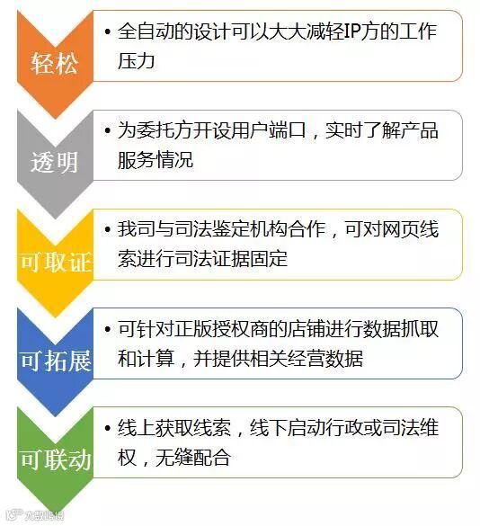 该服务通过添加权利物、电商数据采集、侵权投诉、侵权存证、数据统计五步为版权方提供互联网侵权智能化、自动化综合解决方案。
