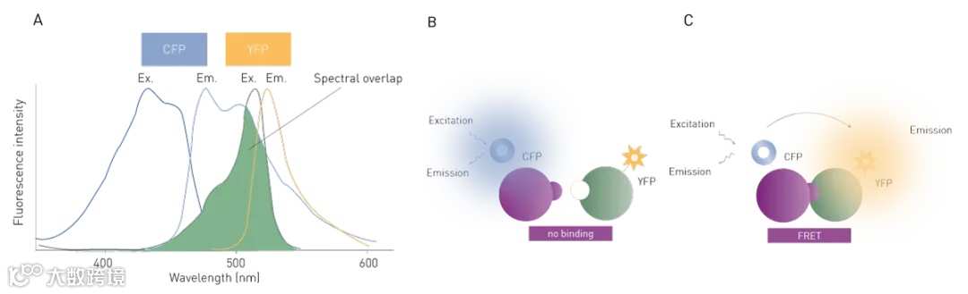 图1:使用CFP和YFP进行 FRET检测的示例。A) CFP 和 YFP 的光谱:CFP(供体)发射光谱与YFP(受体)激发光谱发生重叠(光谱重叠)。B) FRET示意图:在两种蛋白质没有相互作用的情况下,CFP被激发并发出特定波长的光。C) 当两者发生相互作用,FRET发生,YFP发出另一种波长的光,而CFP的发光强度会被淬灭。