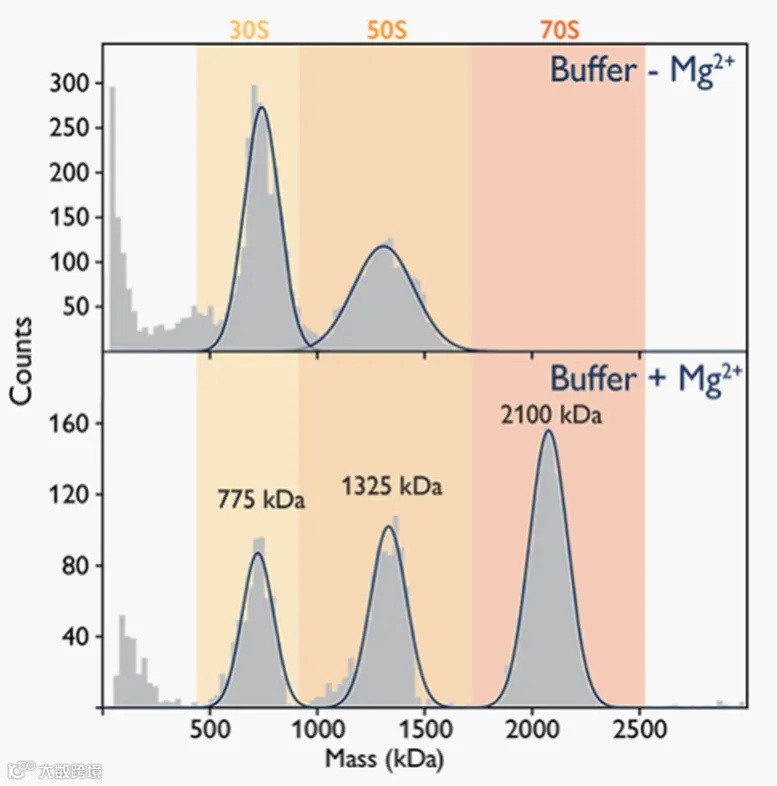 核糖体是蛋白质和RNA的大分子组装体,是蛋白质合成的中心位点。细菌核糖体(在这个例子中来自大肠杆菌)的大小为>2 MDa。镁离子在完整(70S)配合物的组装中起着微妙而重要的作用。在没有镁的情况下,大肠杆菌核糖体迅速分解成它们的30S和50S亚基。质量光度法使我们能够监测这些过程(如下图)。