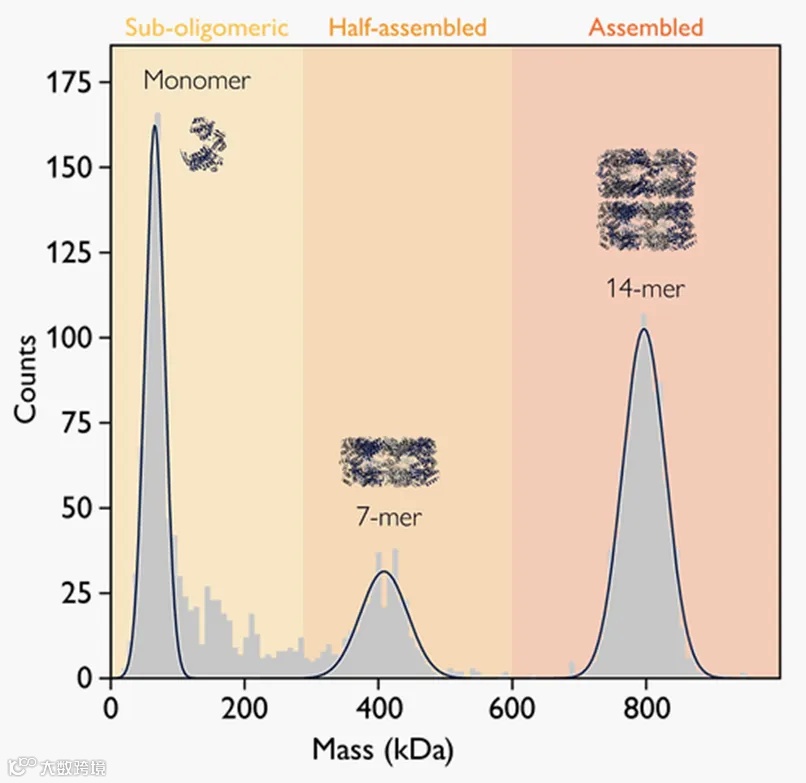 GroEL属于伴侣蛋白家族,因此有助于细胞中其他蛋白质的正确折叠和组装。它由14个单体组成,形成笼状结构。质量光度法可以在不存在或存在ATP的情况下监测该复合物的形成(如下图)。