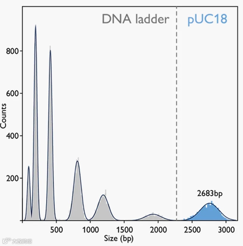 下图显示了标准DNA分子量标准的质量分布,该分子量标准品使用质量光度法测量并用作校准品来确定2,686 bp(~1.8 MDa)DNA质粒(pUC18)的质量数。