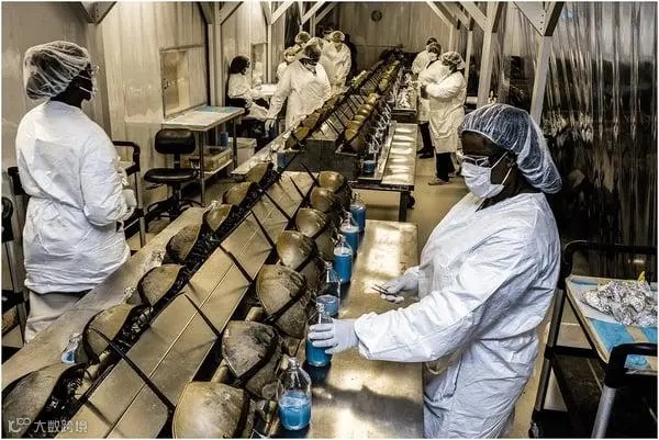 不幸的是,LAL 的生产依赖于一种相对粗放的方式——捕捉鲎(2015 年超过 50 万只),以采集少量血液(见图 4)。虽然采血后鲎可以被释放,但已知仍有约 10–30% 在运输和/或采血过程中死亡。