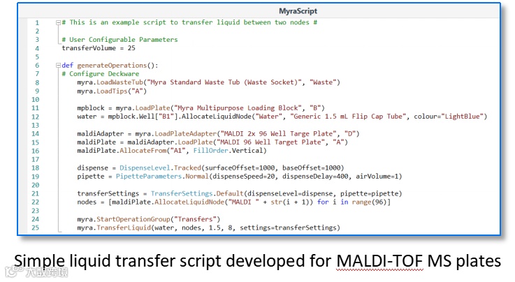 随后根据客户的实验流程开发“simple liquid transfer”脚本,采用Myra迷你工作站自动化进行MALDI-Tof点靶操作,大大提高效率,并保证结果的可靠性和一致性。