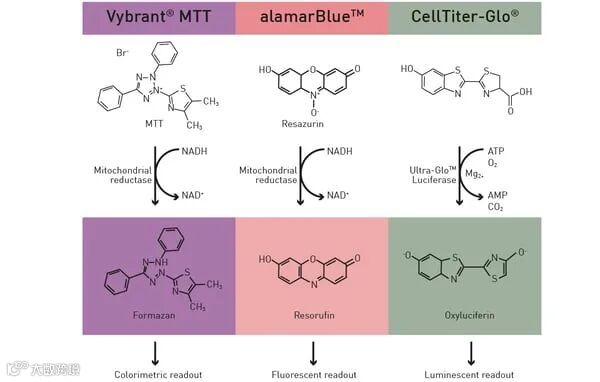 微孔板读板机可以进行多种测定来评估代谢活性。例如Vybrant®MTT法CellTiter-Glo®和alamarBlueTM基于ATP水平或细胞活力的检测提供代谢活性的测量(图3)。