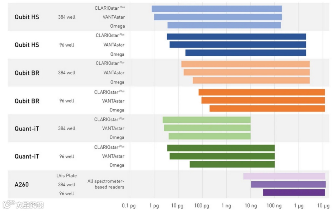 通常来讲,荧光染色法更具特异性,并且能够检测更低浓度的DNA样本。但即使在基于荧光的方法中,不同试剂盒适用的检测浓度范围也存在差异。