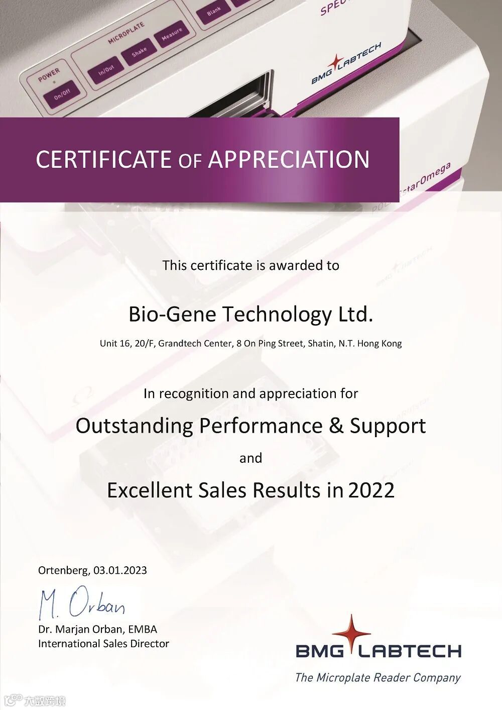 近日伯齐科技荣获德国BMG LABTECH厂家授予的”2022年度优秀表现与销售大奖”!伯齐科技作为BMG LABTECH多功能酶标仪中国独家代理商,于2022年取得了非常出色的成绩,无论是销售还是在售后服务上,都得到了BMG LABTECH厂家的高度赞许和肯定!伯齐科技已第七次获得了该奖项,给予我们极大的信心和鼓励!这不仅展示了BMG LABTECH与伯齐科技的强强联合,共同发展,而且将更有力的激励伯齐科技继续努力再创佳绩!