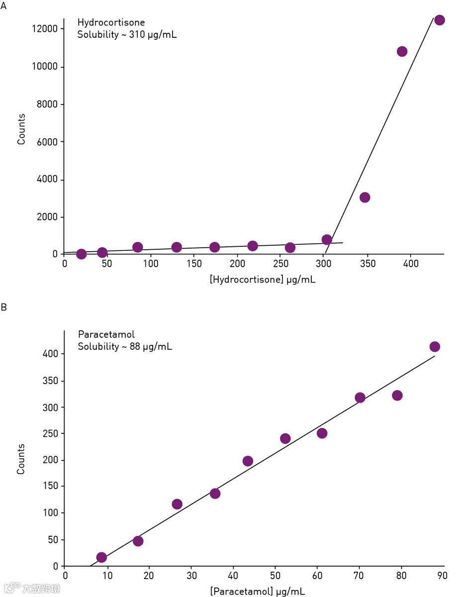 图3. 氢化可的松(A)和对乙酰氨基酚(B)的溶解度评估。氢化可的松溶液中沉淀的化合物对应的读数显著增高。对乙酰氨基酚的读数显示无沉淀点,表明在检测的浓度范围内完全溶解
