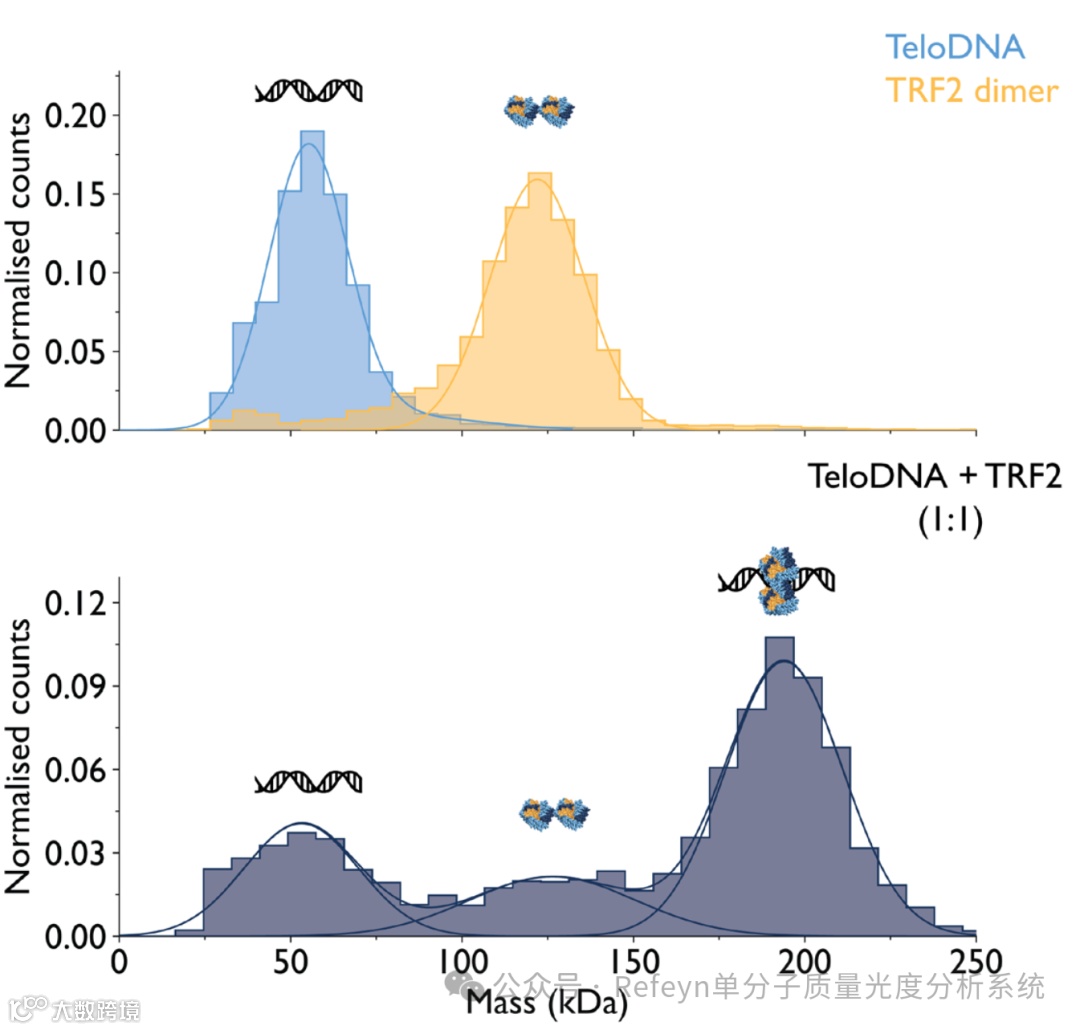 图2. 质量光度法定量溶液中蛋白质,DNA和蛋白质-DNA复合物的质量分布和相对丰度。上图,使用质量光度法分别测量TRF2和端粒DNA(15nM);下图为TRF2和端粒DNA以1:1摩尔比在150nM混合孵育,然后在15nM下使用质量光度法测量,溶液中含有以下组分:端粒DNA(53kDa),TRF2二聚体(126kDa),以及TRF2和DNA以2:1的结合比形成的TRF2-DNA复合物。需要指出的是,该测量使用蛋白质分子作为标准物质获得标准曲线。