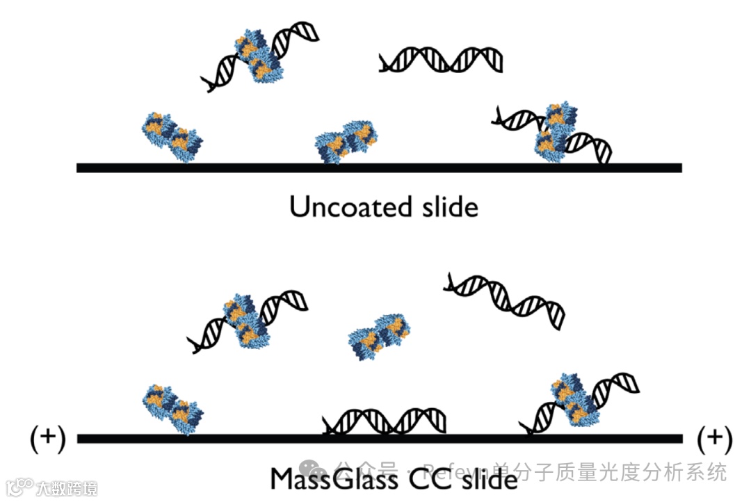 然而,带有强烈负电荷的核酸分子往往被未修饰玻片排斥,这导致核酸分子与玻片的结合频率较低,并且往往是瞬时的,这导致质量光度测定数据中的结合事件比较少,并且定义不是很准确。