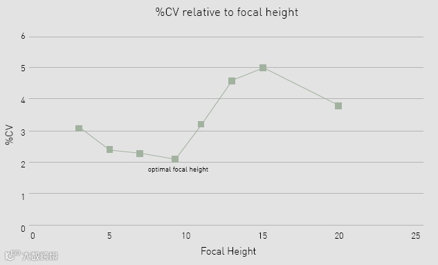 焦距设置也会影响数据点的变化。为了强调这一原理,我们计算了在不同焦距下三个重复的测量的100nM荧光基团标准样品的%CV值。如图3所示,在微孔板读板机确定的最佳焦距9.3下进行测量时,获得了最低的%CV值。在偏离该最佳值的焦高处的测量导致更大的变异。虽然对于低于最佳高度的焦高,%CV的增加不明显,但与最佳条件相比,使用高于9.3mm的高度导致%CV显著增加高达3%。