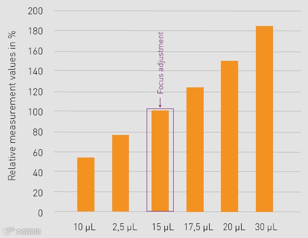 在本案例中,将不同体积(10至30μL)的10nM荧光基团标准品分配到微孔板的不同孔中。在具有15μL样品体积的孔上进行焦点调节。随后用获得的设置测量所有样品,并将测量数据相对于来自15μL孔的测量数据进行归一化。如图4所示,在加样量较低或较高的孔上使用15μL体积的最佳焦距将导致显著偏差。即使样品体积只有2.5μL的微小差异也会导致信号强度出现20%的偏差。在某些情况下,这甚至可能导致信号的增加,这是由于在具有更高样品体积的孔中包含的分析物的总量更高。
