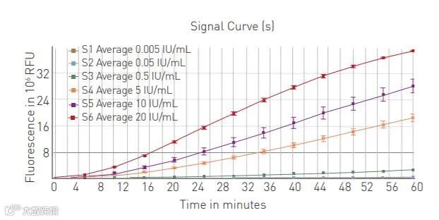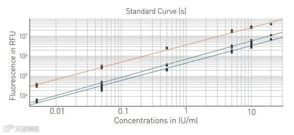 图1. 在同一块板上使用EDR检测从0.005-20IU/ml的标准品