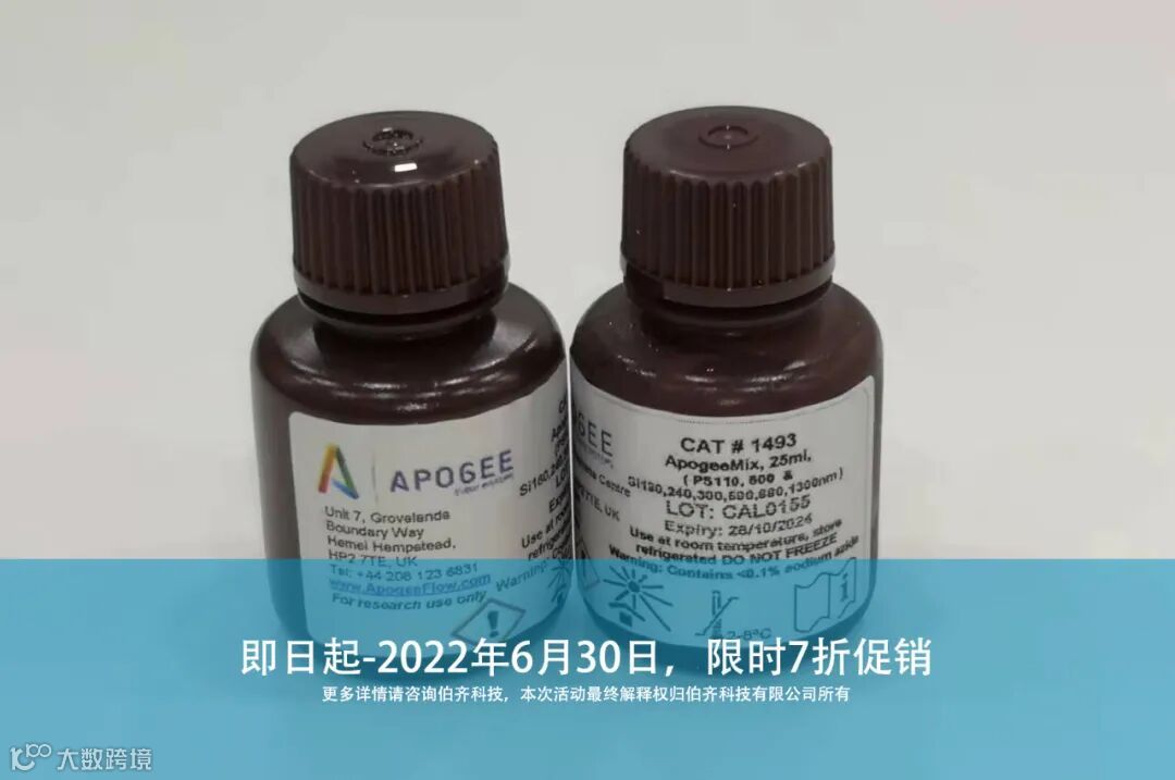 英国Apogee Flow公司的ApogeeMix (Cat #1493)标准微球是一种非常成熟易用的混合标准微球:包括荧光标记的乳胶微球和无荧光标记的二氧化硅标准微球,粒径范围涵盖110nm到1300nm之间不同大小的标准微球。这种混合标准微球不仅可提供简便的方法来评估流式细胞仪散射光和荧光的灵敏度及分辨率,同时,内含多种不同大小的纳米级二氧化硅标准微球,更是可以更接近生物样品折射率的折射率(1.43)对流式细胞仪进行散射光校准,不但是微小生物纳米颗粒流式分析的金标准参考微球,更已成为市面上各大知名流式品牌进行微小生物纳米颗粒流式分析的金标准参考微球(各大流式品牌使用案例请看:MINI TALKS:外泌体流式检测总是做不好?ApogeeMix流式微球金标准来助力)。