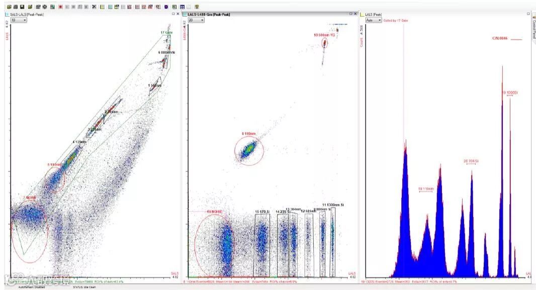 图1:不同大小标准微球在峰形图中的分辨率可很好地展现流式细胞仪的分析性能。理想情况下,8种不同大小的标准微球峰形群应相互分离,并可与仪器噪声明显区分开:6种大小,折射率为1.43的二氧化硅微球和2种大小(110nm和500nm),折射率为1.59的绿色荧光乳胶微球(488nm激光激发)(中间图)。