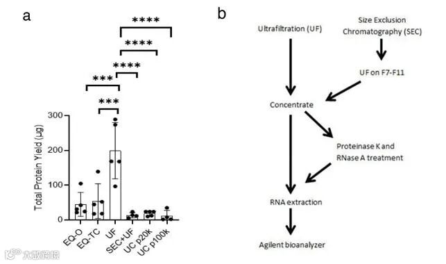 通过Western blot分析发现超速离心法和尺寸排阻分离柱获得更高的颗粒与蛋白比。根据提取的RNA纯度的分析显示,尺寸排阻分离柱是最好的EV分离方法。