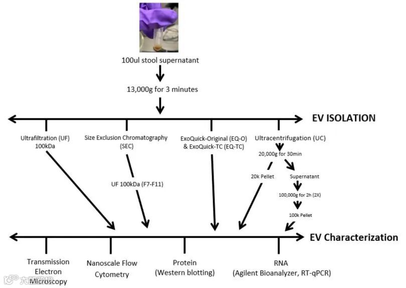 研究人员在测试的五种技术中,认为尺寸排阻分离柱是基于回收率和纯度参数的最适合粪便上清液的EV分离方法。在未来,该方法可用于研究粪便衍生的EVs,作为生物标志物的潜在来源,以提高结直肠癌变之前的检测。