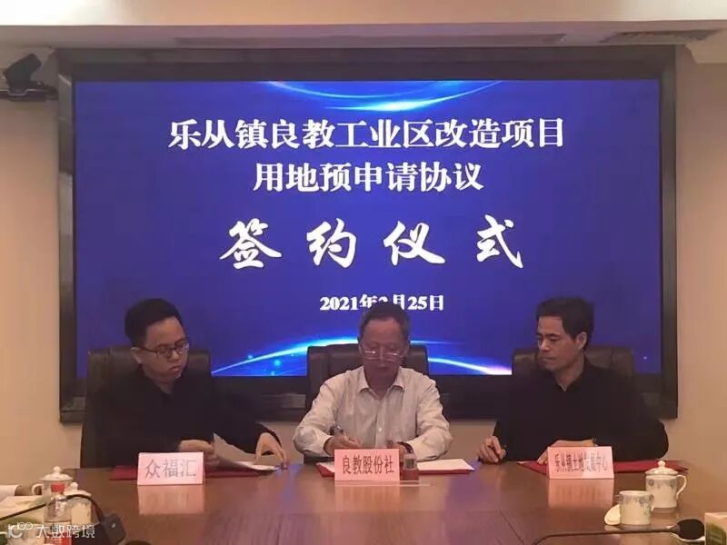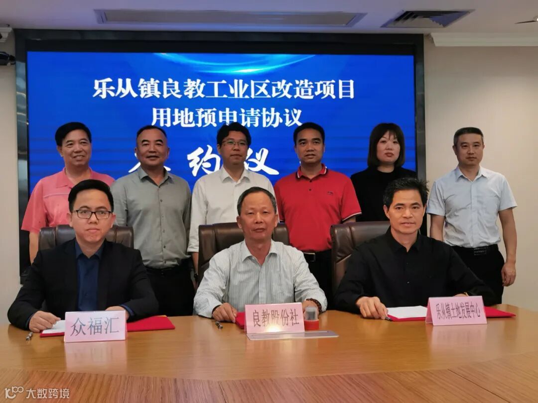 2月25日,在乐从镇党委书记崔伟国、乐从镇镇长冼英伟、乐从镇党委副书记郑建华等领导班子的见证下,乐从镇土地发展中心、良教村股份社及广东众福汇置业投资有限公司三方签订良教工业区改造项目用地预申请协议。