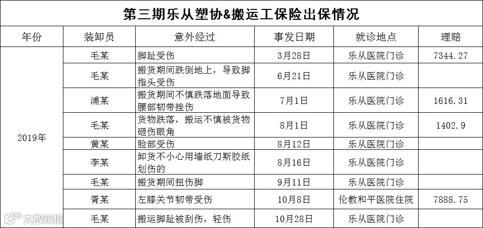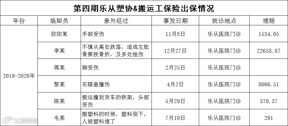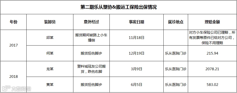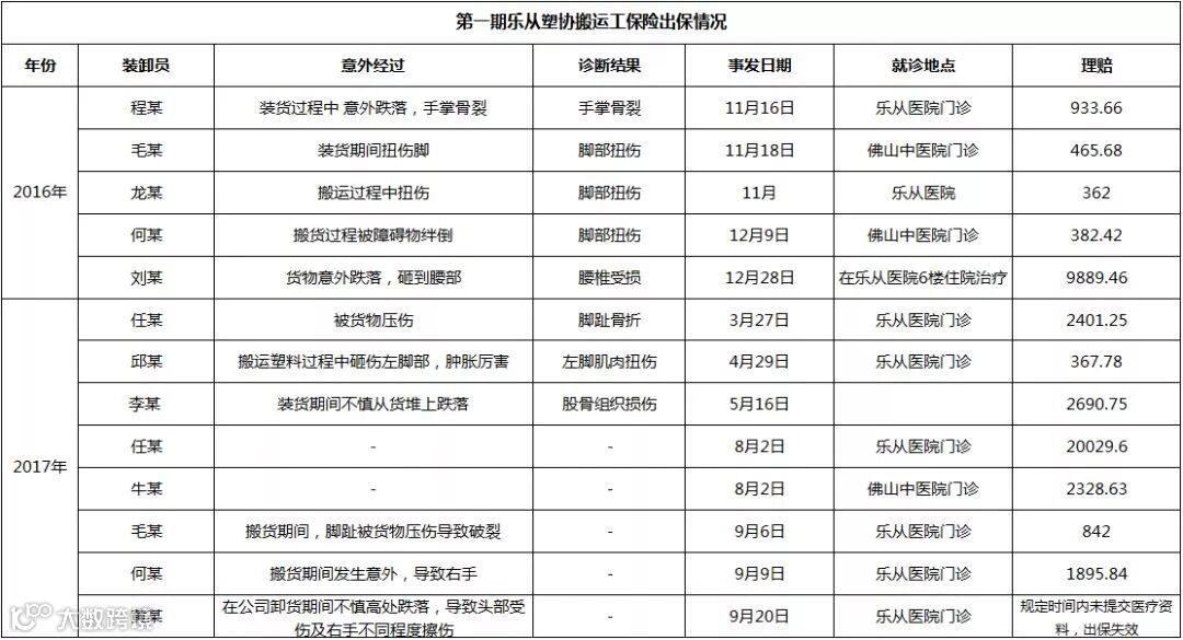 据第一期、第二期、第三期、第四期出险统计,过去乐从塑料城仍然发生多起搬运工事故,其中,保险公司最高赔付近万元医药费,该商户因此避免承担搬运工高额的医药费用,得到了保障避免了损失。