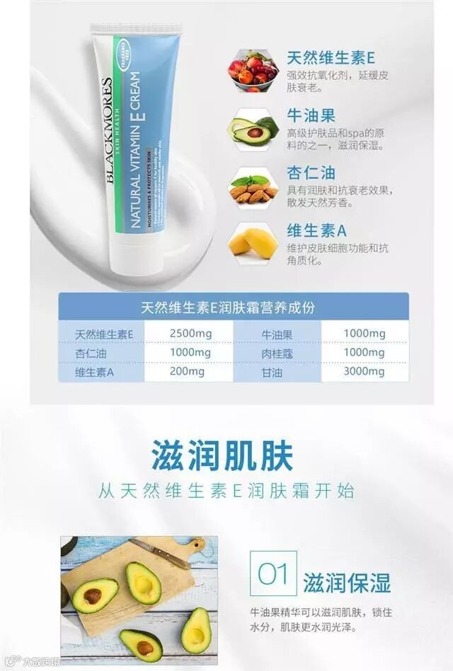 VE面霜是Blackmores家唯一一款护肤品,能称得上是精品中的精品吧。非常天然的面霜,吸收很好,保湿又滋润,不油腻,而且它载有天然来源的维生素E以及鳄梨油、杏仁油、维生素A,能够保湿和滋润肌肤,令肌肤变得柔滑,舒缓干燥引起的不适!而且重点是维生素E是延缓衰老、美容祛斑的瑰宝。