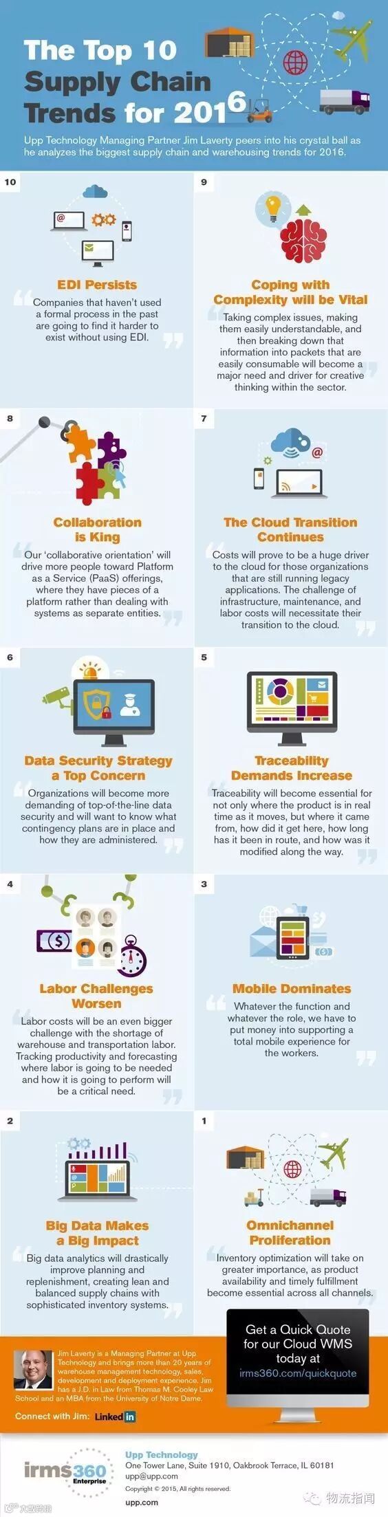 欧美专家总结2016年供应链发展趋势➊O2O全渠道成主流趋势➋大数据驱动供应链巨大变革➌移动互联引爆商业模式➍劳动力问题变得越来越恶化➎可追溯需求越来越多➏数据安全成为最高的管理目标➐云端管理继续成为重点➑供应链协同同样是主流➒供应链顶层驱动是关键➓EDI依然是需求趋势...如图