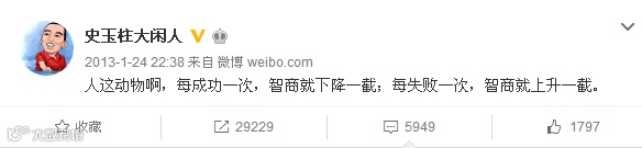 在自己的微博中,巨人网络创始人史玉柱也经常发些自己对失败的反思。例如,“人这动物啊,每成功一次,智商就下降一截;每失败一次,智商就上升一截。”