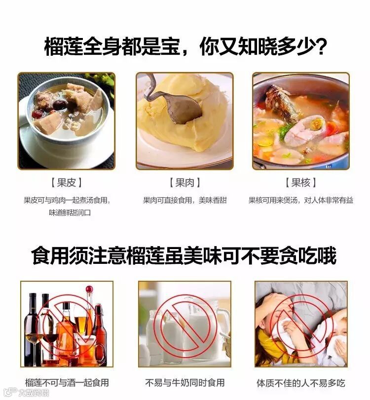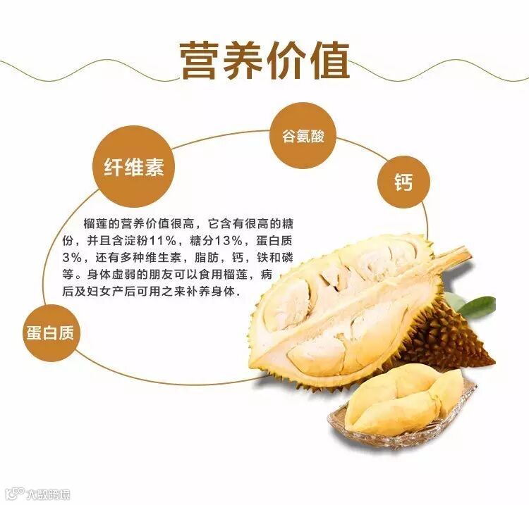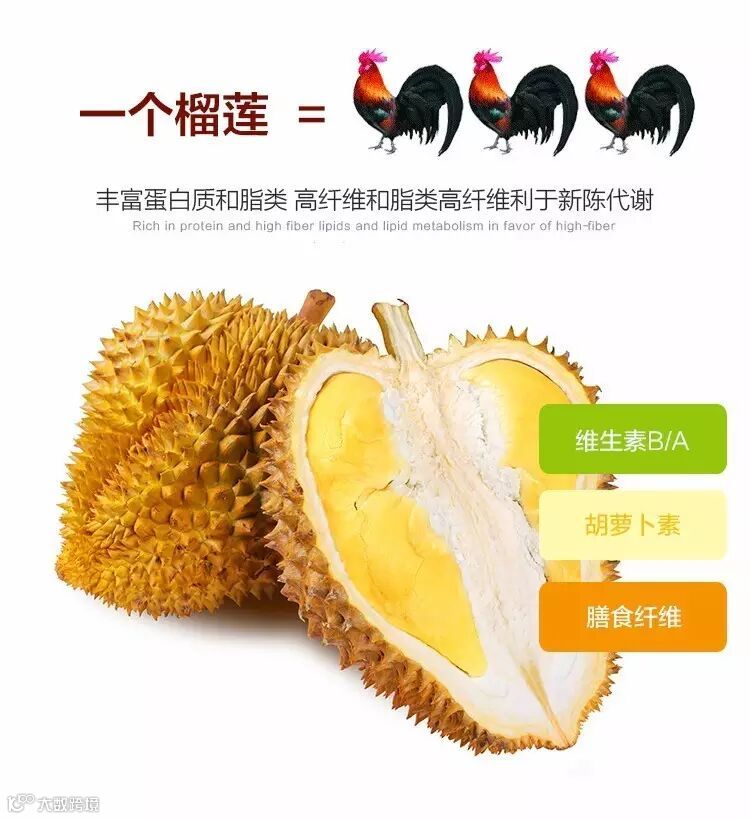 "一个榴莲三只鸡",榴莲是大补之物。榴莲果肉可以滋阴壮阳、增强免疫力、治疗痛经、胃痛、促进食欲、预防和治疗高血压、防癌抗癌、通便治便秘、活血驱寒;榴莲果皮则补血益气、滋润养阴;而榴莲果核则温和补肾、健脾。