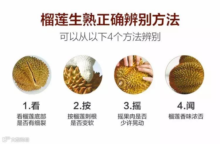 成熟的榴莲,口感甜又糯;未熟的榴莲,果肉硬又涩。那么,怎么判断榴莲是否成熟呢?