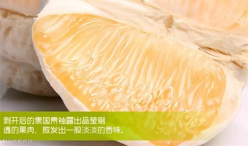 泰国青皮白心柚,每吃一口都是满足,每吃一口都是生活!剥开柚子皮,白水晶般的果肉呈现眼前,柔软多汁的果肉十分诱人。掰下一块轻轻一咬,甜美的汁液在唇齿间荡漾,而且甜度适中酸度很低,吃上几块嘴里都是清爽舒服,留香悠久,感觉舌尖都沐浴在东南亚的清风中。