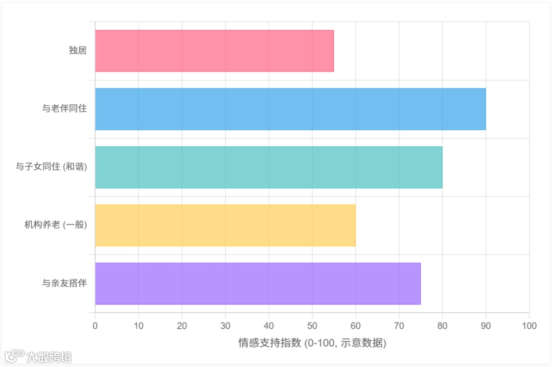 分析角度:此模式侧重于老年人的独立性、既有情感关系的延续以及互助能力。安全风险,尤其是在健康状况下降时的应对,是主要考量。