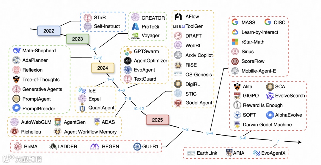 图|2022-2025 年代表性自主进化 agent 框架的演进全景图