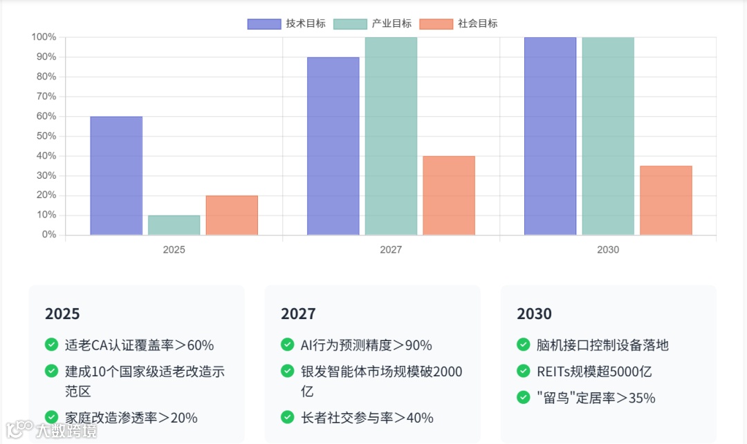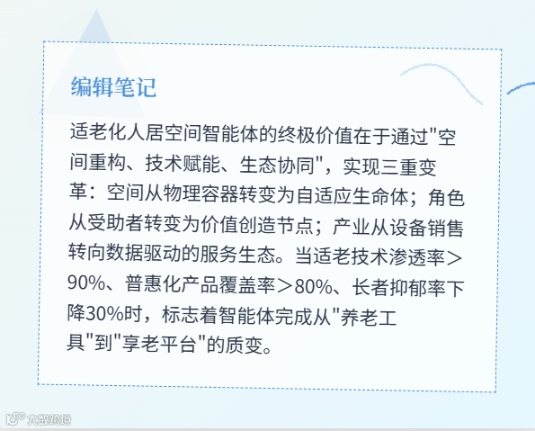 当适老技术渗透率>90%、普惠化产品覆盖率>80%、长者抑郁率下降30%时,标志智能体完成从"养老工具"到"享老平台"的质变。