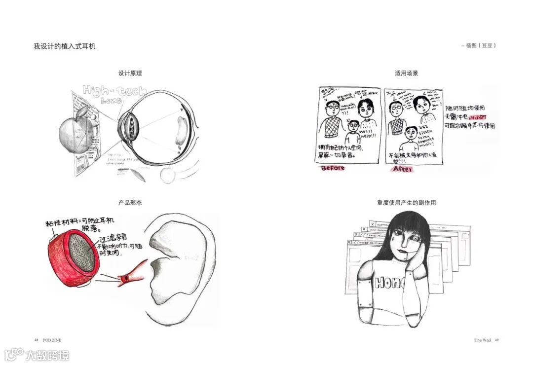 “鉴于现代人对耳机的依赖,她设计了一款未来式的耳机。这是她画下的设计原理和耳机的适用场景。如果不戴这款耳机,你就要一直听父母唠叨,拥有了这款耳机,你就可以对这些唠叨充耳不闻。”
