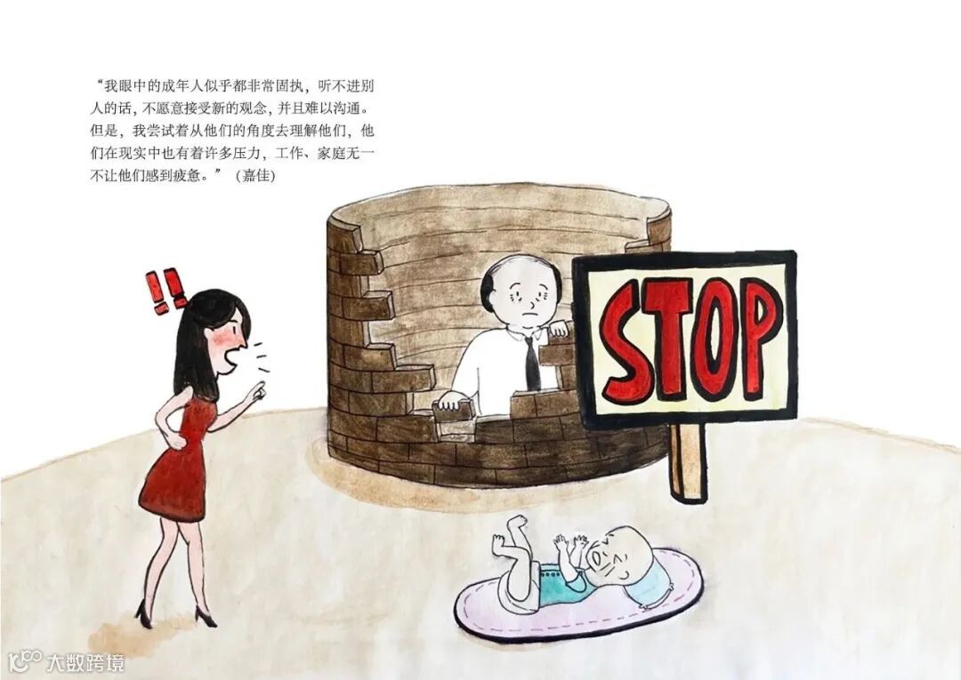 "我眼中的成年入似乎都非常固执,听不进别人的话,不愿意接受新的观念,并且难以沟通。但是,我尝试着从他们的角度去理解他们,他们在现实中也有着许多压力,工作、家庭无一不让他们感到疲惫。"(嘉佳)