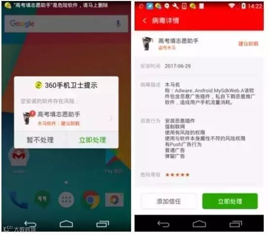 手机搜索“高考”“志愿填报”等关键词,会出现数十家填报志愿APP。360手机卫士发布的消息称,仅今年高考之后,360手机卫士就截获到假冒高考填报志愿的APP106个。