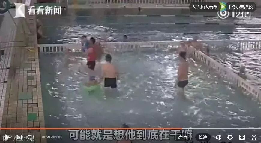 如果不仔细去看,孩子仿佛是在玩水,只是潜入水中,而根本不会想到他溺水了。你会看到,在这个泳池里,孩子周边那么多大人,但没有一个人动手去救那个孩子。