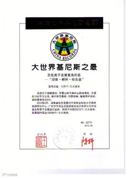 图为:“负氧离子含量最高的县”证书
