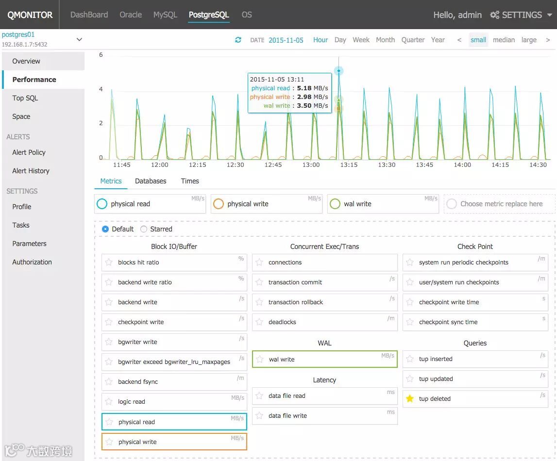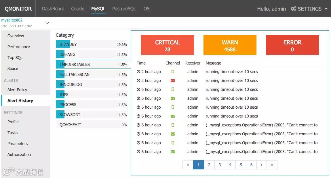 QMonitor是一款针对数据库与主机的专业监控产品,支持对Oracle、MySQL、PostgreSQL数据库,对AIX、HP-UX、RHEL、CentOS等操作系统的监控。通过预置监控模板,全方位对监控目标运行异常进行报警;通过收集数百种关键性能指标, 帮助用户追溯性能历史,定位性能问题。