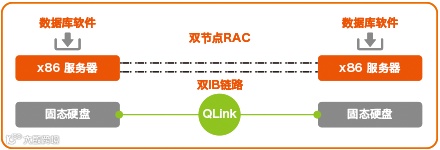 双节点SAN-Free架构是在三层架构的QData for Oracle一体机基础上做了重要改进,只需两台配置了PCI-E Flash或者SSD的x86服务器,无需IB交换机,存储节点,大大降低成本的同时又确保了RAC的高可用、高性能以及可扩展性。