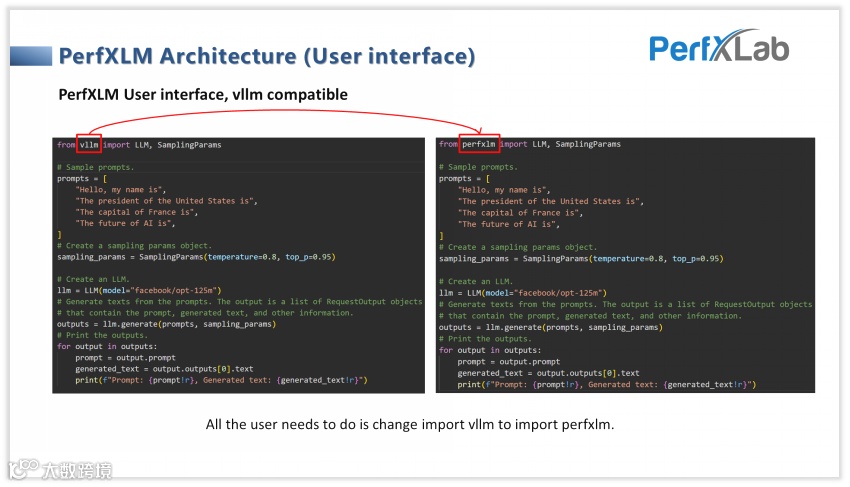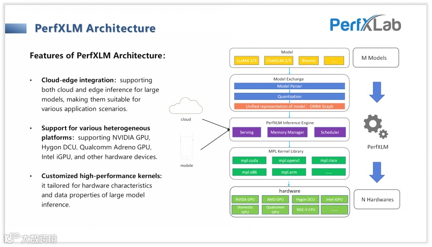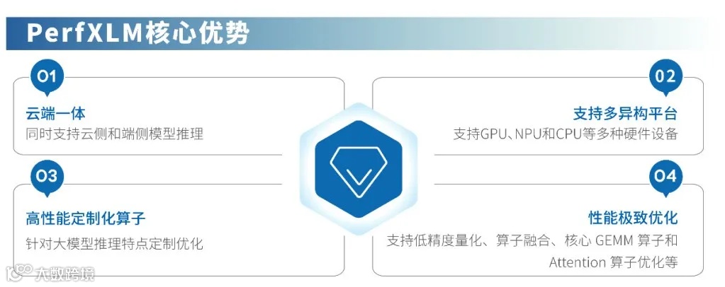 PerfXLM是澎峰科技推出的一款专用大模型推理引擎,它旨在为各种主流模型提供快速适配多种异构硬件的解決方案。作为一款强大的推理引擎,支持云端GPU算力,还能兼容端侧轻量级处理器,同时集成了异构计算支持、多卡并行处理以及极致性能优化等多重功能。用户只需通过一键部署,即可轻松享受PerfXLM带来的便捷与高效。