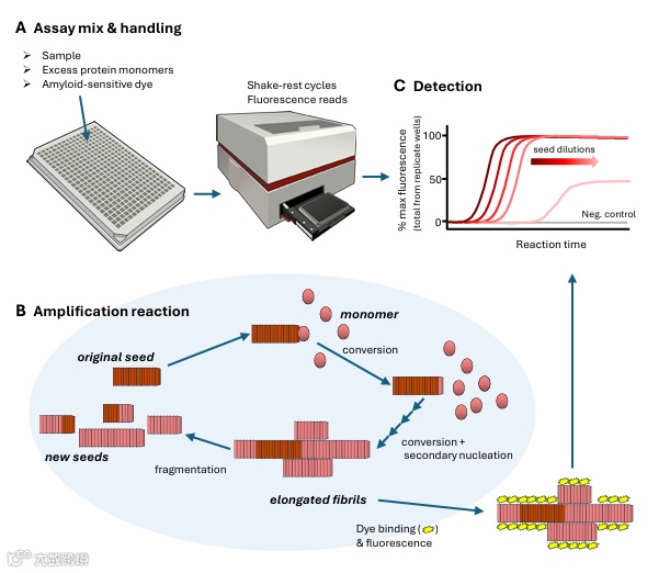 蛋白病的核心病理是特定蛋白质异常聚集形成淀粉样蛋白,而SAAs利用其种子聚合机制,实现了病理性淀粉样蛋白种子的超灵敏检测,这类种子也是蛋白病的病因学生物标志物。作为 SAAs 核心类型的RT-QuIC检测,从朊病毒病专属技术,已拓展至突触核蛋白病、tau 蛋白病等多种蛋白病领域。其中,朊病毒病RT-QuIC检测已广泛用于临床诊断与治疗研发,α-突触核蛋白SAAs可在疾病前驱期鉴别路易体病等,tau SAAs 能完成tau蛋白病分型检测。