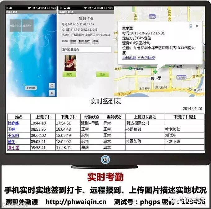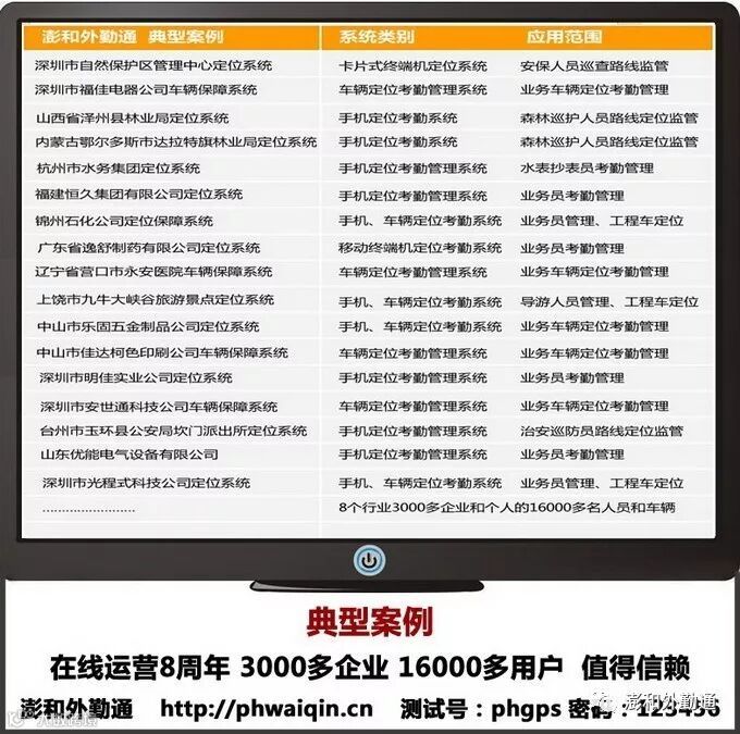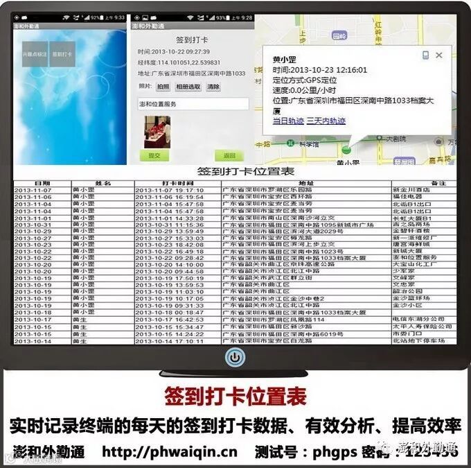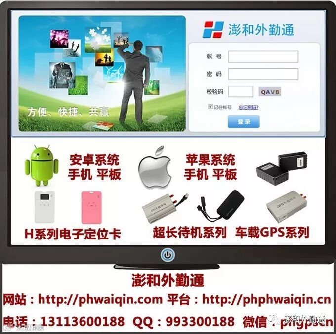 澎和外勤通是一种运用于安卓、苹果智能手机(平板电脑)、车载GPS机、移动GPS机等设备上的专用软件,提供实时位置、活动轨迹、电子围栏、安全保障、考勤管理等服务。
